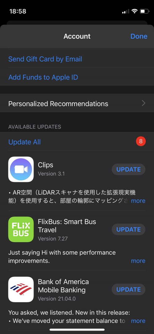 また、一度海外のアプリをダウンロードした携帯を日本でそのままつかう場合にも、日本のApple IDでログインしている状態だとアップデートすることができません